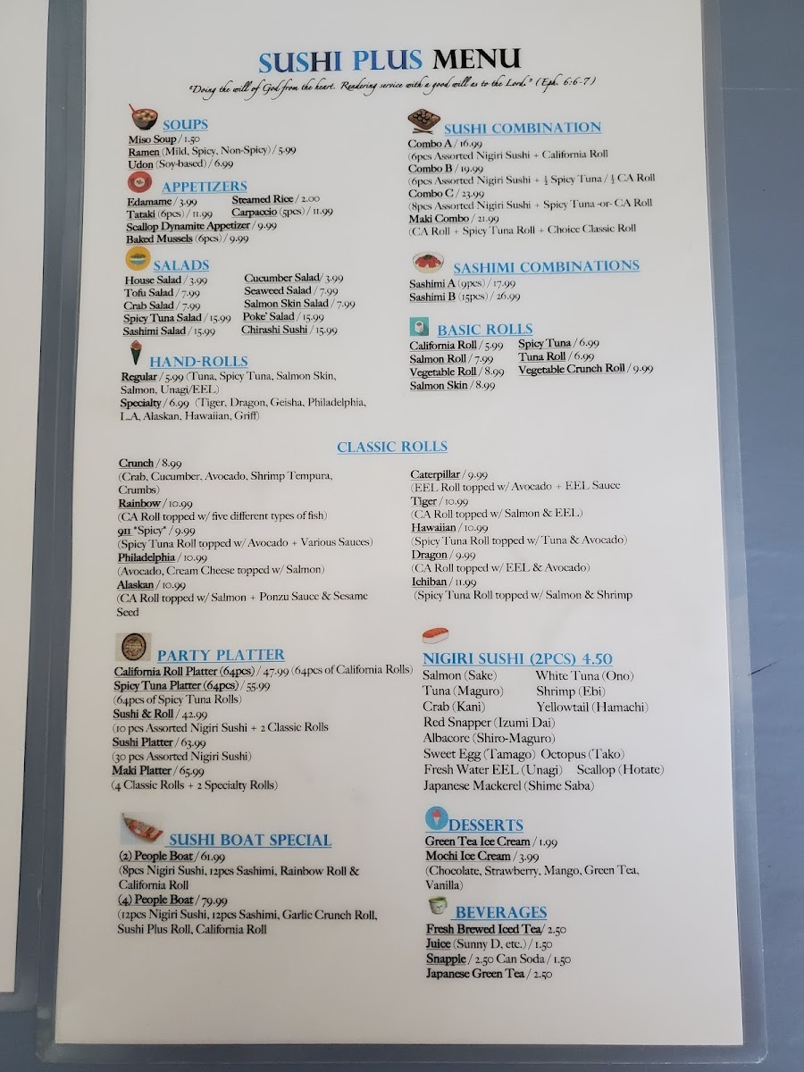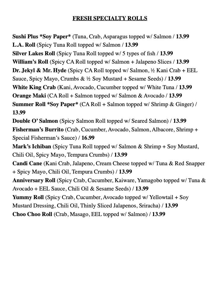 Welcome to Sushi Plus, an exceptional sushi destination located at 27170 Lakeview Dr, Helendale, CA. This delightful eatery offers a diverse menu that caters to both sushi enthusiasts and newcomers alike. The selection of basic rolls features fan favorites like the California Roll and Spicy Tuna Roll, all reasonably priced to ensure a satisfying meal.